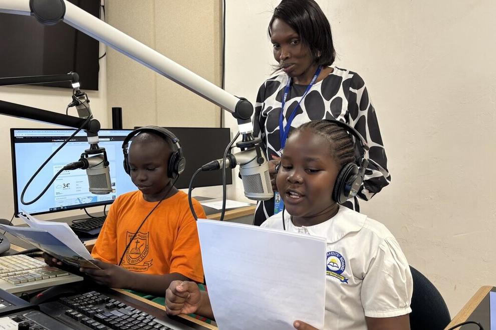 11-year-old Naima Alex from the Juba Parents School reads the news to Radio Miraya listeners as schoolchildren take over the airwaves on the Day of the African Child.