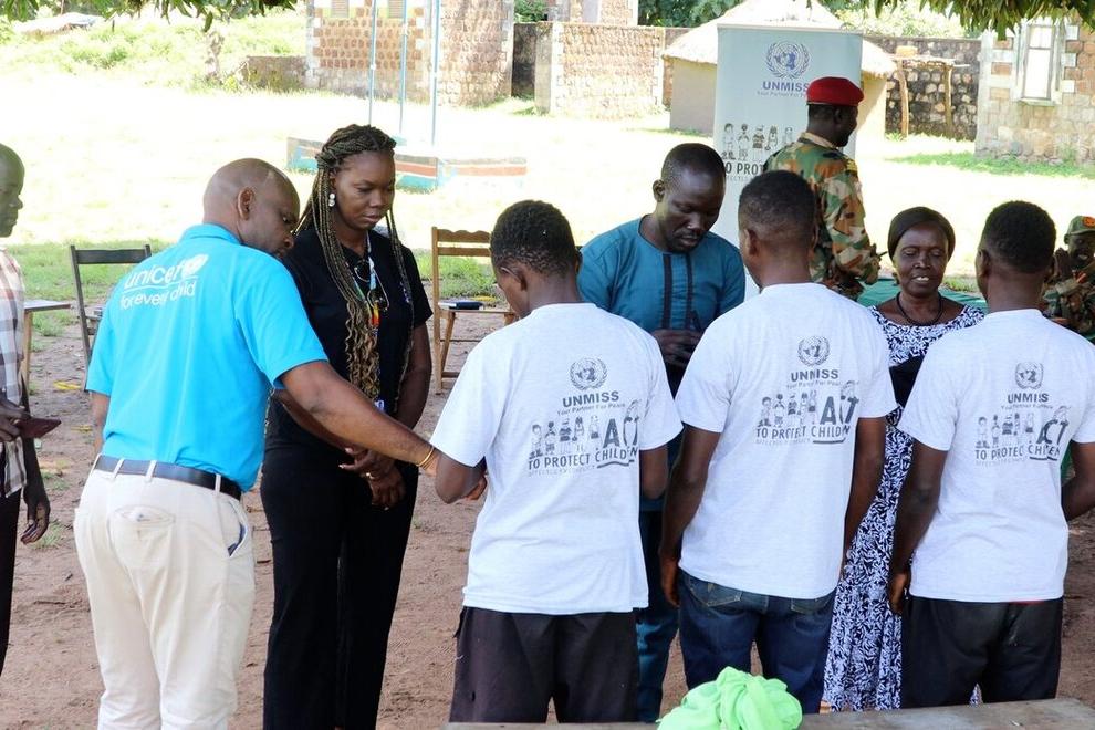 Three children stand under mango trees with a few belongings as they are released from South Sudanese armed forces and begin a new life.