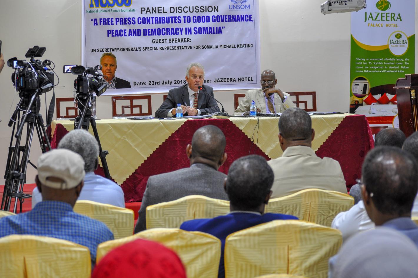Addressing an audience of senior journalists and civil society representatives in Mogadishu, the United Nations envoy to Somalia today highlighted the important role played by its media and reaffirmed the world body’s support…