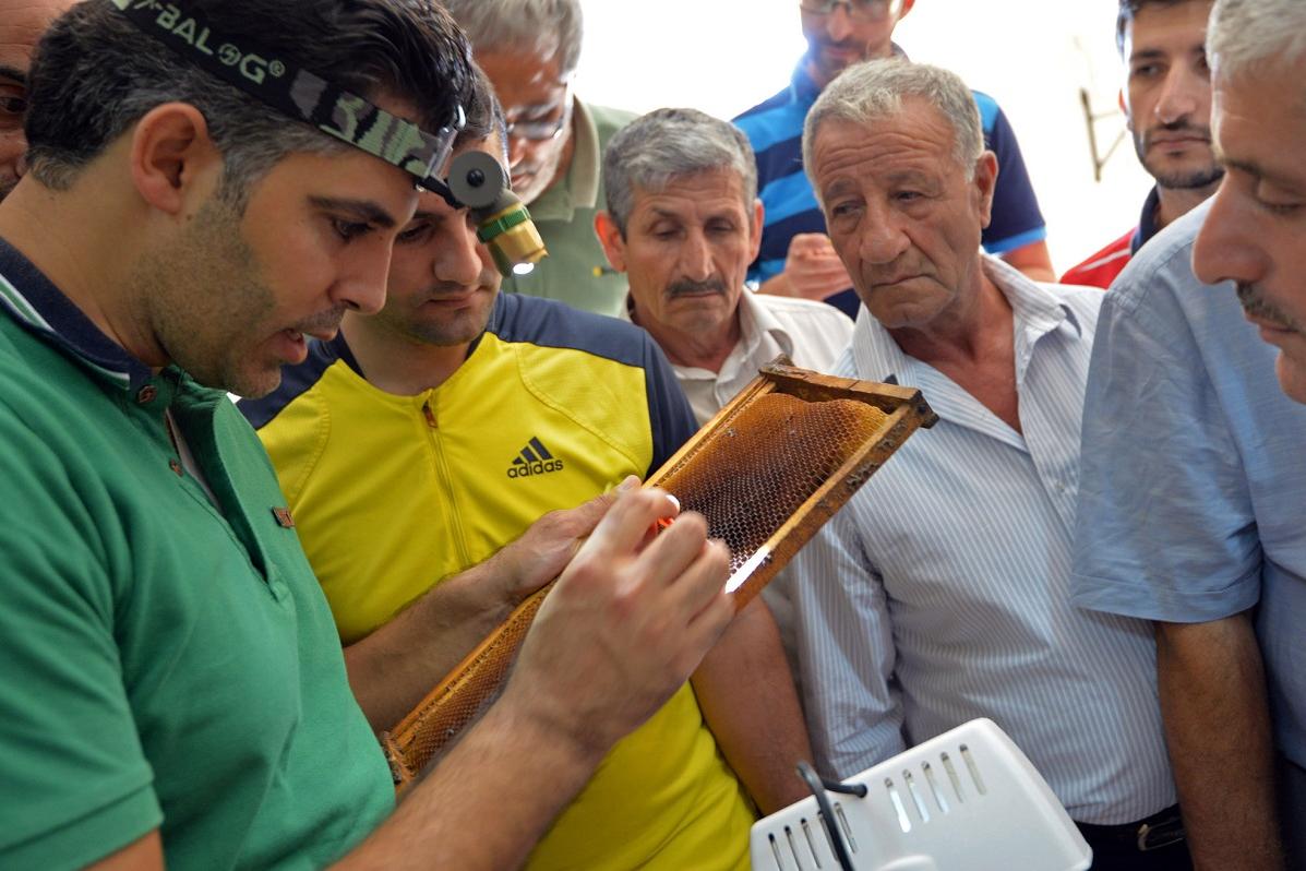 The beekeepers move in closer to the instructor, Ali Yasin, as he prepares to plant some queen bees. Yasin, a beekeeper himself and an expert in cultivating queens, holds up a honeycomb and explains how he prepared it in…