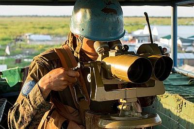 UNMISS peacekeeper looking through binoculars as he keeps watch at the gate leading into mission’s base in Unity State capital Bentiu, where over 47,000 internally displaced people are seeking shelter. Photo: UNMISS / JC…
