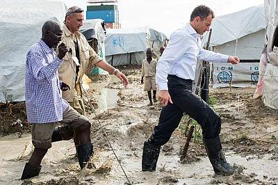 UN Humanitarian Coordinator Toby Lanzer walking through flooded protection site at UNMISS base in Unity State capital Bentiu where more than 40,000 people are seeking shelter. Photo: UNMISS / JC Mcilwaine