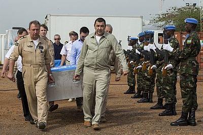 UNMISS aircraft crew carrying remains of fallen crew to a memorial service in Juba today. The three crew members died when their helicopter came down near Bentiu, Unity State, on 26 August. Photo: UNMISS/ JC McIlwaine
