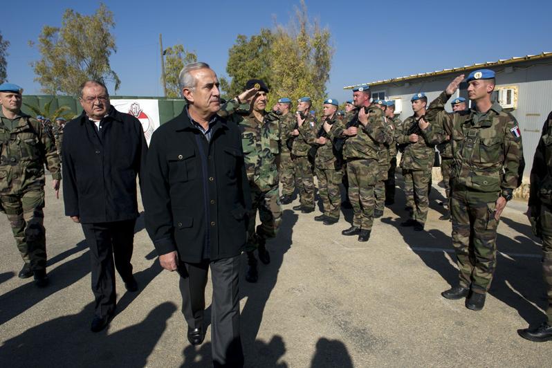 President Michel Sleiman reviews UNIFIL French troops on arrival for a visit to the "Force Commander Reserve" base at Deir Kifa in south Lebanon where he met with the injured French peacekeepers.