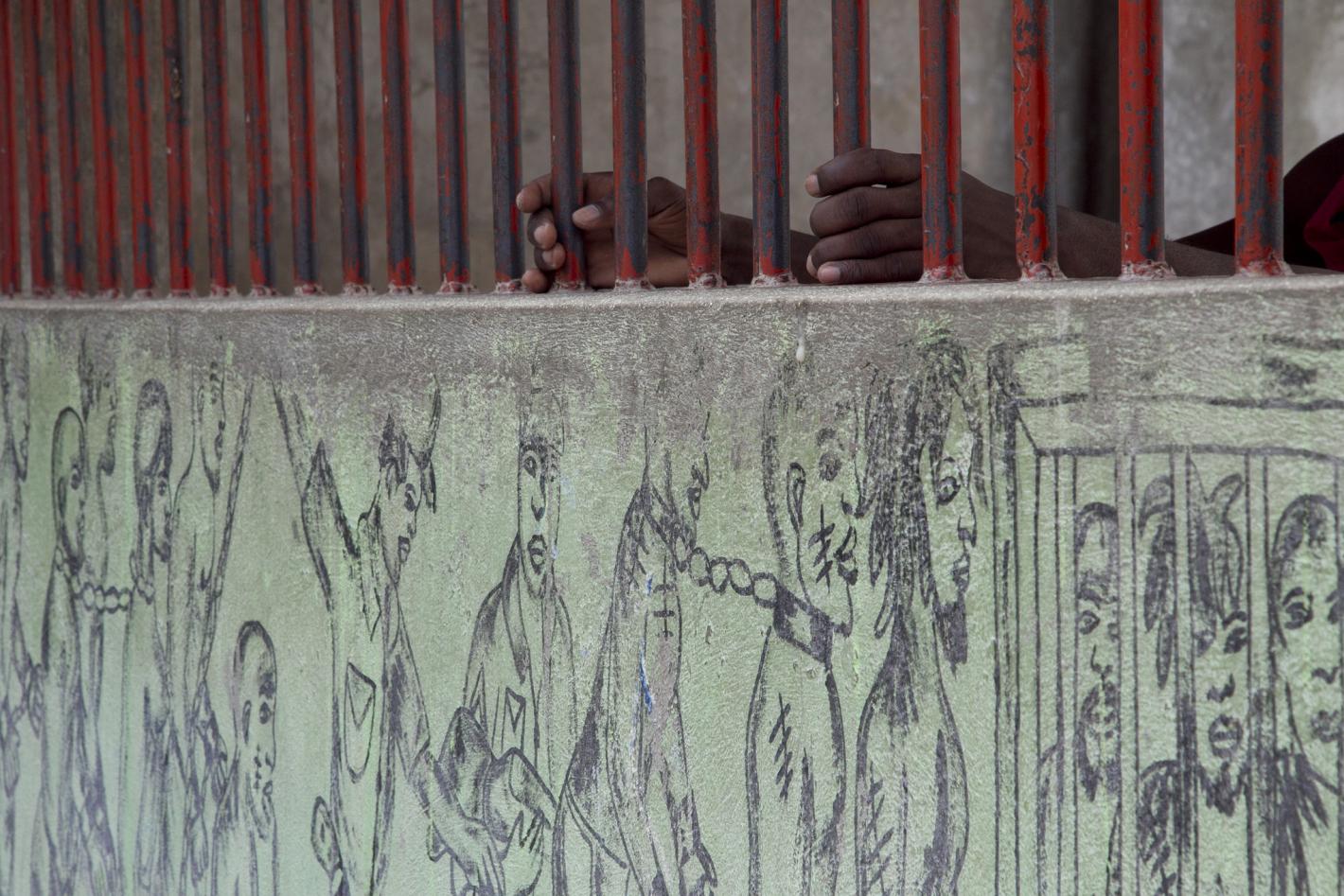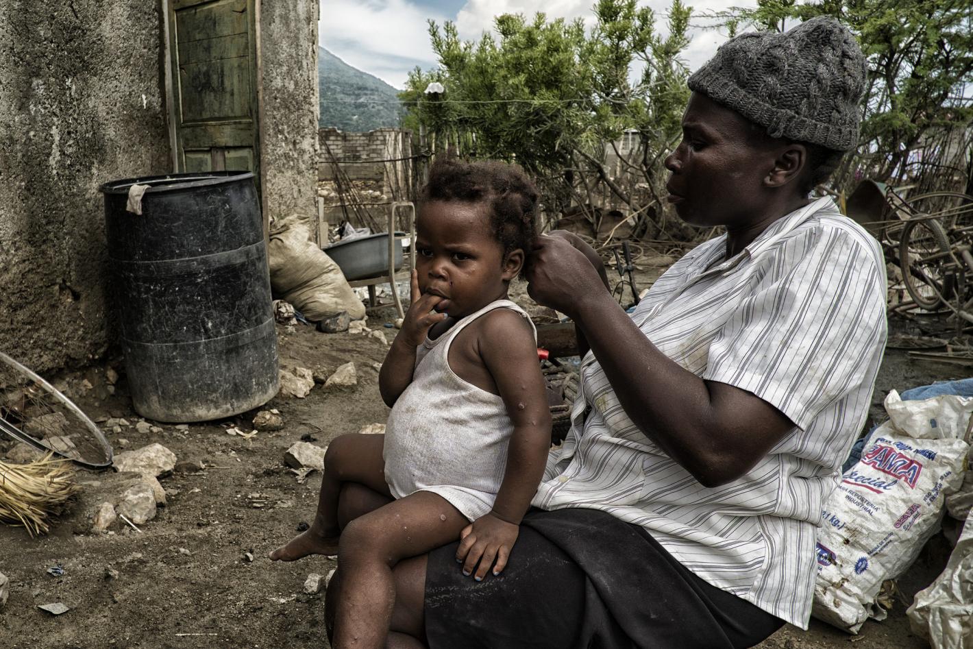 Photo - Logan Abassi - UN/MINUSTAH Dans le quartier de Blue Hills, il est environ 10 heures 30, dans la cour située devant sa maison, grande ouverte, assise sur une petite chaise en paille de latanier, Mme Richemont défait…