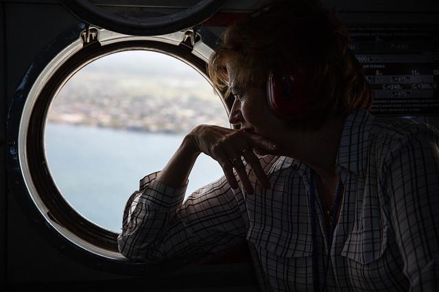 La SRSG regarde par la fenêtre de l’hélicoptère de la MINUJUSTH sur le retour d'une visite dans la région du Nord-Est, en Haïti. © Leonora Baumann / UN / MINUJUSTH, 2019